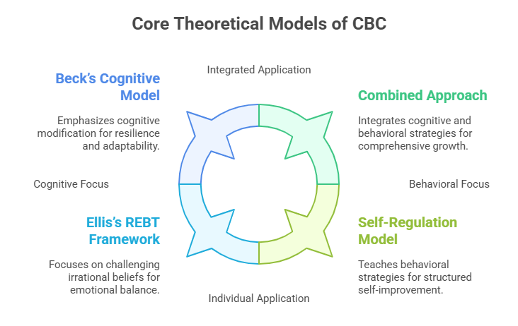 CBC draws its strength from multiple cognitive-behavioral theories, including Beck’s Cognitive Model, Ellis’s Rational Emotive Behavior Therapy (REBT), and the Self-Regulation Model. Beck’s model emphasizes the identification of automatic negative thoughts and their role in shaping emotions and behaviors. In CBC, this model is adapted to coach clients in recognizing and modifying these thought patterns to foster resilience and adaptability.