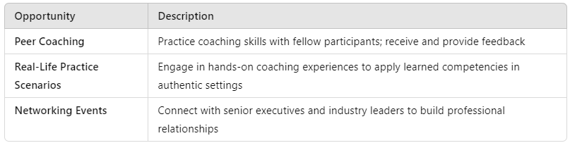 Practical application of coaching skills is embedded into the curriculum through real-life practice scenarios. These opportunities for hands-on learning are crafted specifically to cultivate proficient coaching abilities in participants, equipping them adequately for future professional coaching positions.