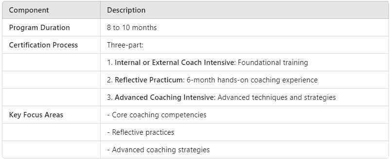 The three-part certification procedure imparts foundational skills to prospective coaches while also focusing on reflective practices and sophisticated strategies. This extensive method equips them with a robust grasp of coaching foundations, readying them for success across diverse coaching environments.