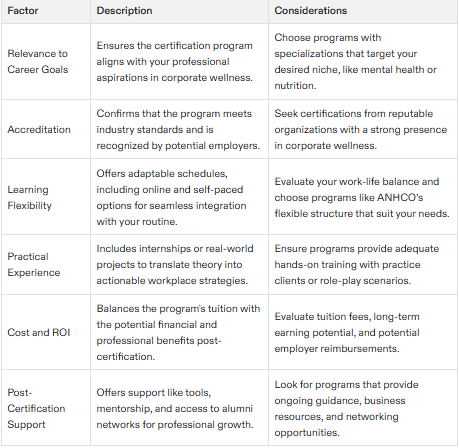 Seek out programs offering adaptable learning modalities along with real-world experience as they play an integral role in managing both academic pursuits and other life responsibilities effectively while obtaining vital hands-on skills indispensable for proficient wellness coaching practices. By thoroughly assessing these considerations, you will be able to identify a certification program tailored specifically towards facilitating a fulfilling journey within the realm of corporate wellness careers.