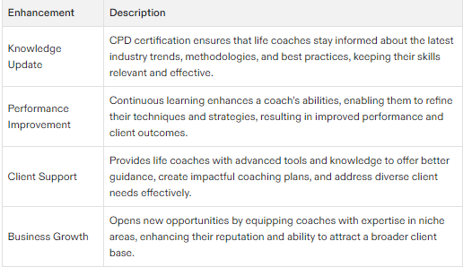 Ongoing professional development through CPD not only increases a coach’s credibility but also opens opportunities for business growth and specialization.