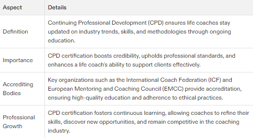 CPD certification is essential for life coaches to stay updated on industry trends, enhance skills, and improve client support.