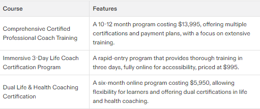 For those seeking a thorough and comprehensive training program accredited by the International Coaching Federation, the IPEC coach training program and CreativeMind’s Jungian Life Coach Certification are excellent options. The IPEC program lasts 10-12 months and costs $13,995, offering payments as low as $169/month. Graduates earn the Certified Professional Coach (CPC), Energy LeadershipTM Index Master Practitioner (ELI-MP), and COR.E DynamicsTM Specialist certificates.