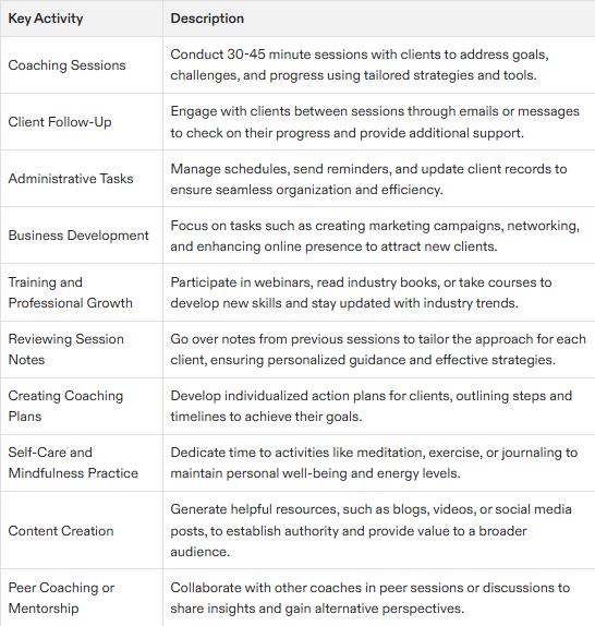 A typical day for a life coach involves a mix of coaching clients, client engagement, and business development activities.