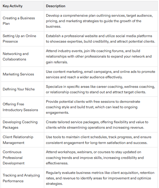 Building a life coaching business involves various activities, including marketing, networking, and professional development.
