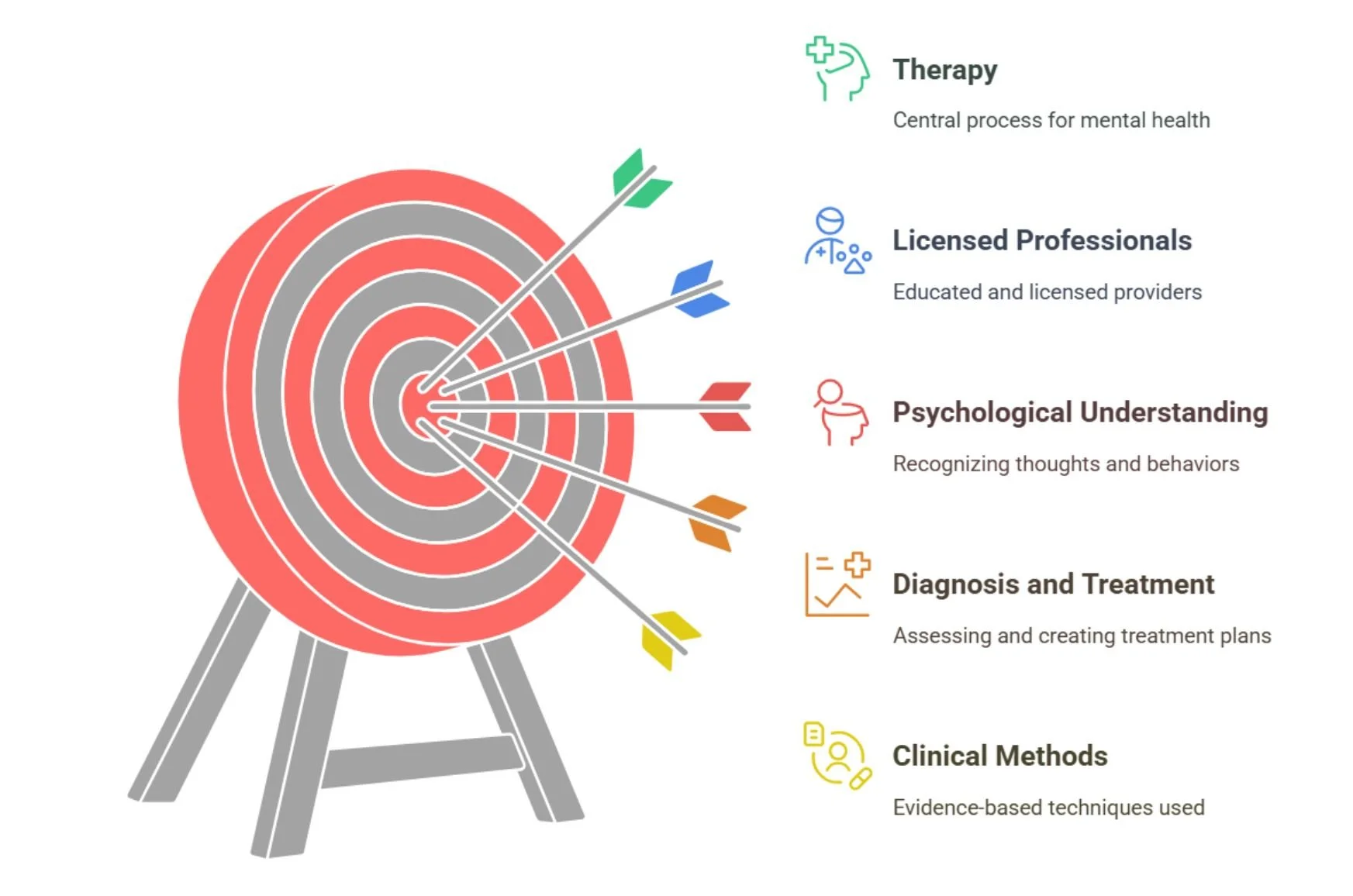 Focuses on understanding psychological patterns: Therapy helps individuals recognize deep-seated thoughts, emotions, and behaviors that influence their mental well-being.