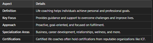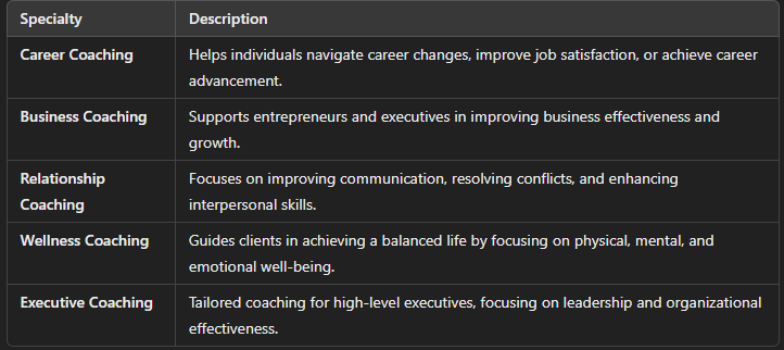 Most life coaches specialize in specific areas, such as business, relationships, or career development.