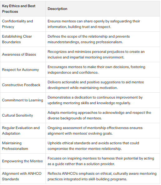 By following these ethics and best practices, mentors can create a safe, supportive, and effective mentoring relationship that benefits both the mentor and the mentee. This commitment to ethical mentoring not only enhances the mentoring experience but also contributes to the professional development of both parties.