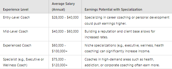 Earnings can vary widely based on experience, specialization, and location. On average, life coaches earn between $28,000 to $73,000 annually. Certified health or life coaches can earn between $50,000 and $75,000 annually, with specialists in certain niches earning upwards of $100,000.