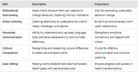 To be a successful health coach, key skills include motivational interviewing, active listening, and effective goal-setting. Additionally, possessing cultural competency and strong nonverbal communication will greatly enhance your coaching effectiveness.