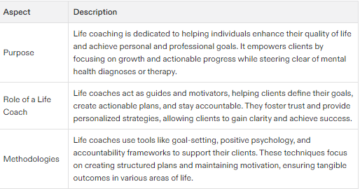 Life coaching focuses on personal growth and goal attainment, distinct from therapy, and involves empowering clients to define and achieve their goals.