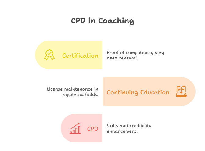 CPD (Continuing Professional Development), certification, and continuing education (CE) are often lumped together, but they serve radically different purposes in a coach’s career. Certification is typically a one-time credential that signals you've met a baseline competency—such as completing a foundational coach training program. CE, on the other hand, is usually tied to licensed professions (like counseling or healthcare) and requires specific topic hours to maintain legal credentials.