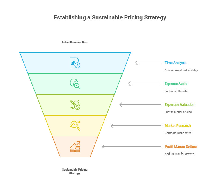 By adding these components together, you create a minimum viable rate—the lowest amount you can charge while still meeting your income goals. Anything below this threshold compromises either your earnings or your ability to deliver quality service at scale.