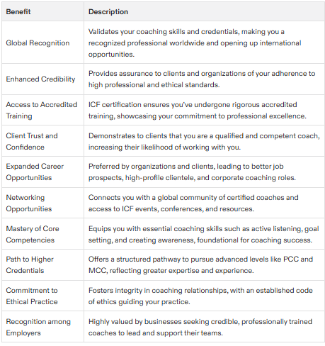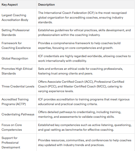 The ICF provides a framework for coaches to develop their skills and expertise and maintain a high level of professionalism.
