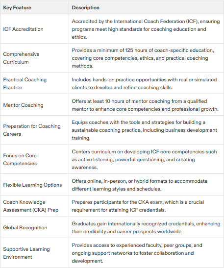 Choosing the right coaching certification training program is important. Ensure the program includes practical components such as a coaching session to apply learned skills. Look for programs that are ICF-accredited and meet the ICF standards.