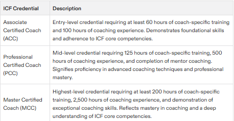 The ICF offers three levels of credentials for professionally trained coaches: Associate Certified Coach (ACC), Professional Certified Coach (PCC), and Master Certified Coach (MCC).