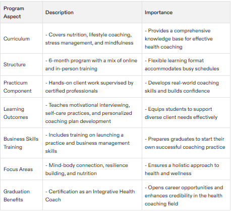 The program also includes a practicum component, where students work with clients under the supervision of a certified Integrative Health Coach.