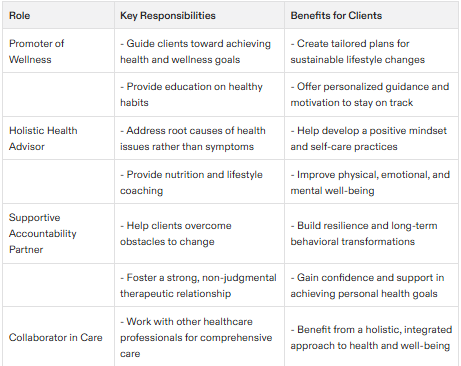 They work with clients to set and achieve health and wellness goals, and provide support and guidance throughout the process.