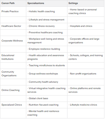 The field of Integrative Health Coaching also offers a range of career opportunities, from working in healthcare alongside medical doctors to starting a private practice.