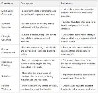 The program also covers the importance of nutrition and lifestyle coaching in achieving health and wellness goals.