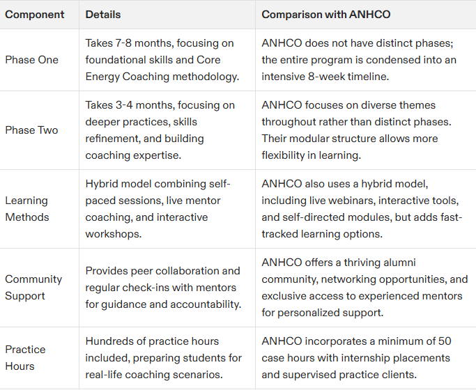 The program covers various coaching models and techniques, including the iPEC’s proprietary Core Energy Coaching method.