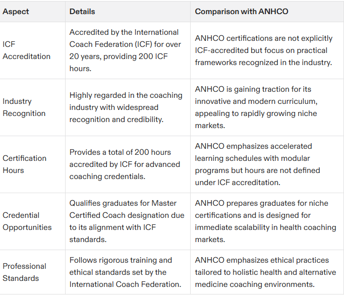 iPEC Coaching offers a comprehensive and well-regarded life coach certification program that provides multiple certifications, including Certified Professional Coach, Energy Leadership Index Master Practitioner, and Specialist certification. It is a highly recognized program in the coaching industry, accredited by the International Coach Federation (ICF) and provides 200 ICF-accredited hours, preparing students for the Master Certified Coach designation. The program includes a blend of self-paced learning, live sessions, and mentorship, along with ongoing peer support. iPEC’s focus on personal and professional growth, along with specialized niche tracks such as Health and Wellness Coaching, Executive Coaching, and Performance Coaching, allows individuals to tailor their learning. Graduates report high satisfaction and success in launching or growing their coaching practices, making iPEC an excellent investment for serious career development in coaching.