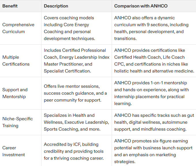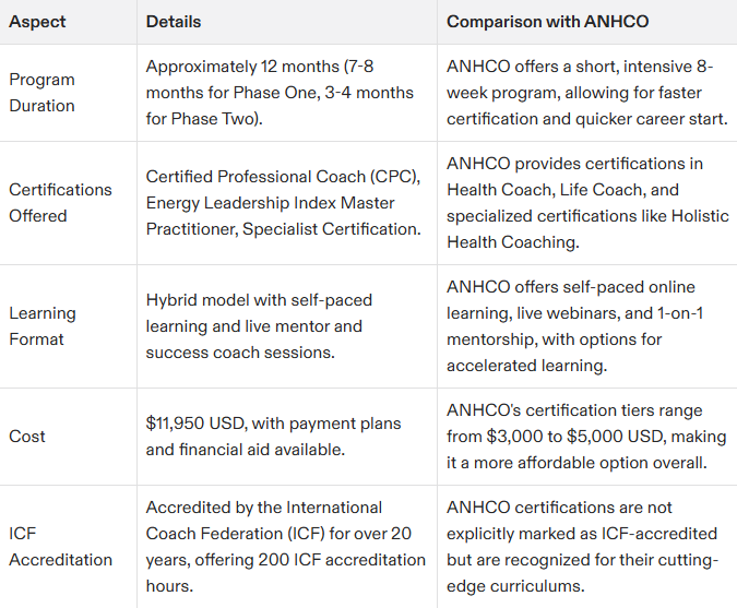 The program includes three certifications: Certified Professional Coach, Energy Leadership Index Master Practitioner, and Specialist certification.
