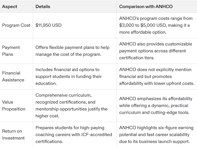 The program is an investment in your coaching business and career. This investment is crucial for establishing credibility and gaining valuable credentials in the competitive coaching industry.