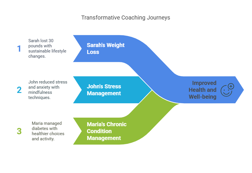 Sarah struggled with weight loss for years. Despite trying various diets and exercise programs, she couldn’t maintain her progress. She decided to work with a certified health coach who helped her identify and overcome emotional eating triggers, set realistic goals, and develop a sustainable fitness routine. With her coach’s support, Sarah lost 30 pounds and has maintained her healthy lifestyle for over a year.