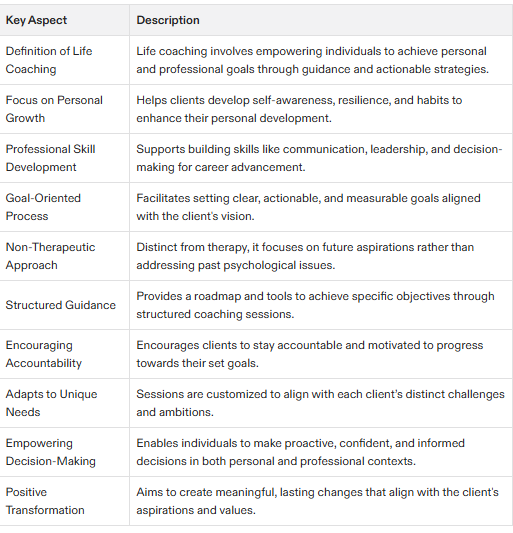 A comprehensive life coaching program often includes practical training, mentorship opportunities, and flexible formats such as in-person or online learning.