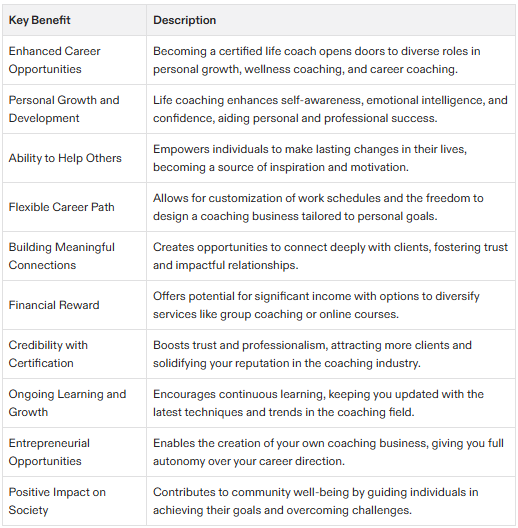 Life coaches work with clients to establish healthy habits, strengthen interpersonal skills, and achieve goals. These programs also contribute significantly to personal development, helping aspiring coaches explore their passions and motivations.