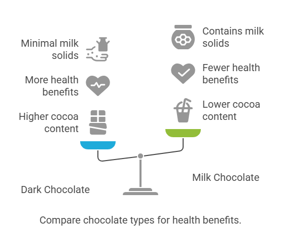 Dark chocolate, on the other hand, is made by combining cocoa solids (often from cocoa powder) with cocoa butter and a small amount of sugar. Unlike milk chocolate, dark chocolate contains no or minimal milk solids, making it a richer source of antioxidants and flavonoids. The higher the cocoa content (typically 70% or higher), the darker the chocolate and the more potential health benefits it offers.