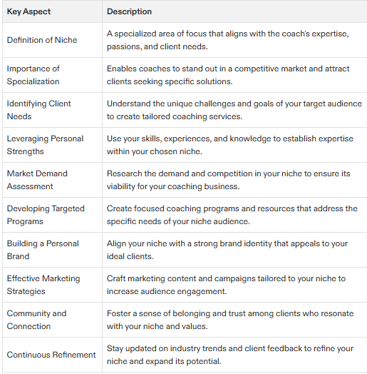 A coaching niche is a specialized area of focus that allows a coach to hone in on specific client needs, such as life coaching, wellness coaching, or career coaching. Identifying your niche is essential in standing out in a crowded market and attracting clients who are seeking the unique services you offer. By aligning your niche with your passions, skills, and experience, as well as considering market demand and competition, you can carve out a space that is uniquely yours.