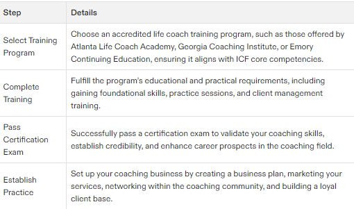 To become a certified life coach in Atlanta, select an accredited training program that adheres to ICF core competencies, complete the training, pass the certification exam, and then focus on establishing your coaching practice.