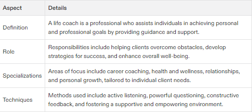 A life coach is a professional dedicated to helping individuals achieve their personal and professional aspirations through a dynamic coaching process. Life coaches work closely with clients to identify and overcome obstacles, develop effective strategies for success, and enhance overall well-being. They may specialize in various areas such as career development, relationships, health and wellness, or personal growth, tailoring their approach to meet the unique needs of each client.