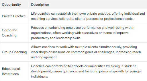 Group coaching and online coaching are also popular options, allowing coaches to reach a broader audience and offer flexible services. Additionally, life coaches can work in schools or non-profit organizations, contributing to the personal development of students and community members.