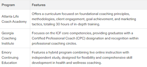 Top certification programs include the Atlanta Life Coach Academy, Georgia Coaching Institute, and Emory Continuing Education, each offering unique training approaches and credentials.