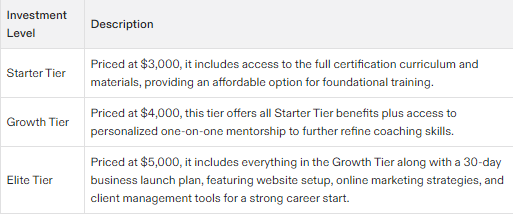 The starting investment level for the Health and Life Coach Certification Program is $3,000, a valuable step towards building a rewarding career.