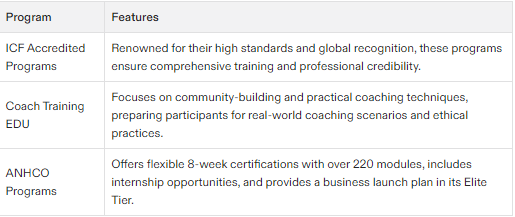 In Colorado, numerous certification programs are available for those interested in becoming life coaches, all providing distinct characteristics and specialized areas of emphasis. These programs cater to a range of necessities whether it’s acquiring hands-on coaching abilities, engaging with supportive peers or seeking mentorship. Coach Training EDU is notable for its thorough methodology that prioritizes both tangible coaching techniques and community backing.