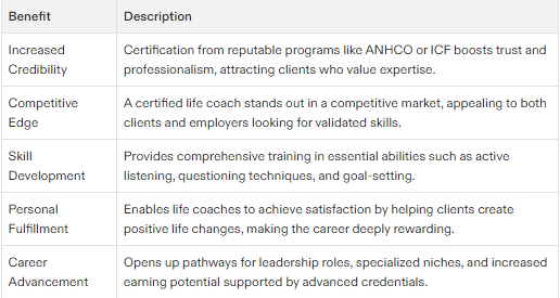 Obtaining life coach certification can have numerous benefits for aspiring life coaches. For one, it demonstrates a level of expertise and professionalism in the field, which can increase credibility and trust with potential clients. Certification can also provide a competitive edge in the job market, as many employers and clients prefer to work with certified coaches. Additionally, the process of obtaining certification can help life coaches develop their skills and knowledge, leading to greater confidence and competence in their coaching practice.