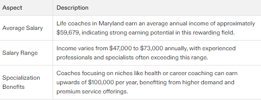 Embarking on a career as a life coach can be both fulfilling and profitable. In the state of Maryland, life coaches typically earn an average yearly income of approximately $59,679. The salary range in this region varies from around $47,000 to about $73,000 per annum. Employment for life coaching professionals is projected to expand by 6% up until 2028 within Maryland.