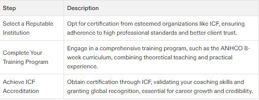 Opting for ANHCO to achieve your certification equips you with a rich course of study, practical experience, and extensive support necessary for initiating your own business in coaching. With earnest commitment to proper training underpinned by dedication, you are well-placed to forge ahead with a prosperous career as a coach while positively influencing the lives of those who enlist your guidance.