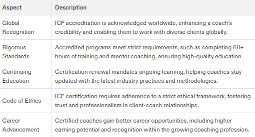 Professional Development: ICF accreditation provides a framework for professional development, helping coaches improve their skills and knowledge. This structured approach to growth ensures that you continue to evolve as a coach and deliver the best possible service to your clients.