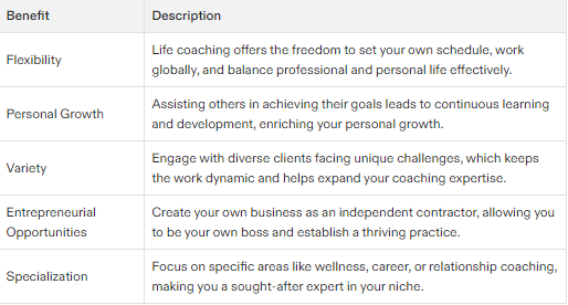 Flexibility: As a life coach, you have the freedom to work with clients from all over the world, set your own schedule, and work at your own pace. This flexibility allows you to balance your professional and personal life effectively.