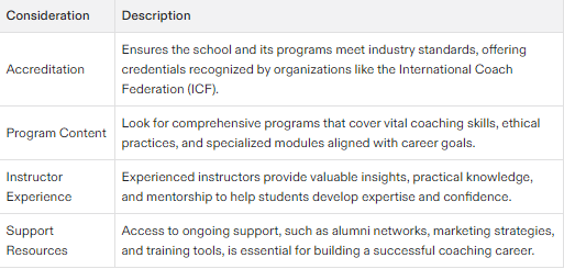 Consider the school’s accreditation and reputation in the coaching industry.