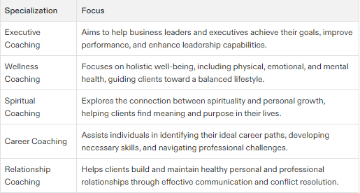 Executive Coaching: Focuses on helping business leaders and executives achieve their goals and improve their performance.