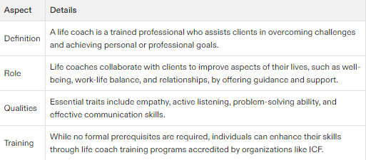 Life coaches use qualities like empathy, active listening, and problem-solving to help people improve their personal or professional life.