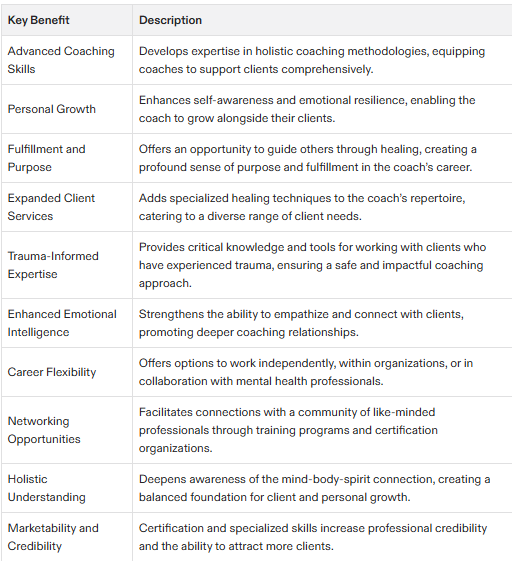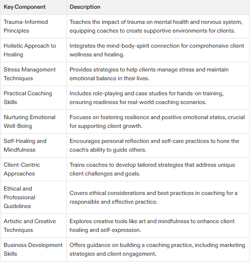 Trauma-Informed Coaching: a certification program that focuses on coaching through a trauma-informed lens, understanding the impact of trauma on mental health and the nervous system.