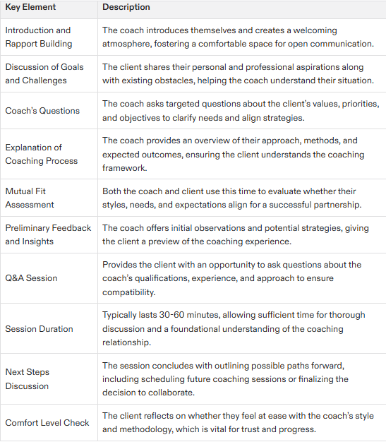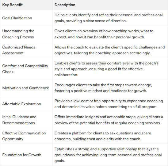 It’s an opportunity for both the coach and the coaching client to engage in a mutual assessment process, where they evaluate their fit and expectations, and the coach can effectively communicate the benefits of their services to encourage participation from potential clients.