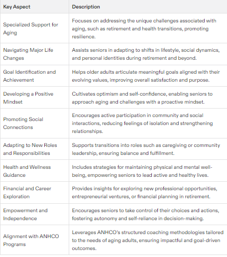A life coach can provide support and guidance as individuals navigate life transitions, including retirement and aging. Life coaching can help seniors explore new possibilities that enhance their sense of purpose and fulfillment.